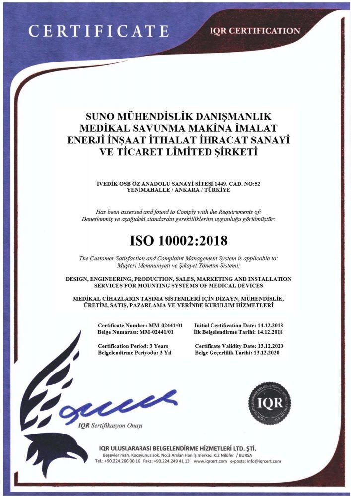 Müşteri beklenti ve ihtiyaçlarının karşılanması günümüzde kurumsal firmaların en önemli hedefleri arasında yer alıyor. Suno Medikal olarak biz de müşterilerimizin geri bildirimlerini ve olası şikayetlerini değerlendirme adına ISO 10002 Müşteri Memnuniyeti Yönetim Sistemi belgesi başvurusu yaptık. Yapılan değerlendirmeler sonucu gereken şartları taşıdığımız değerlendirilmiştir. Bu şekilde müşterilerimizi önemsediğimizi belirtiyor, olası sorunların aşılması için çözüm yollarının bulunması adına bu önemli adımı atıyoruz.